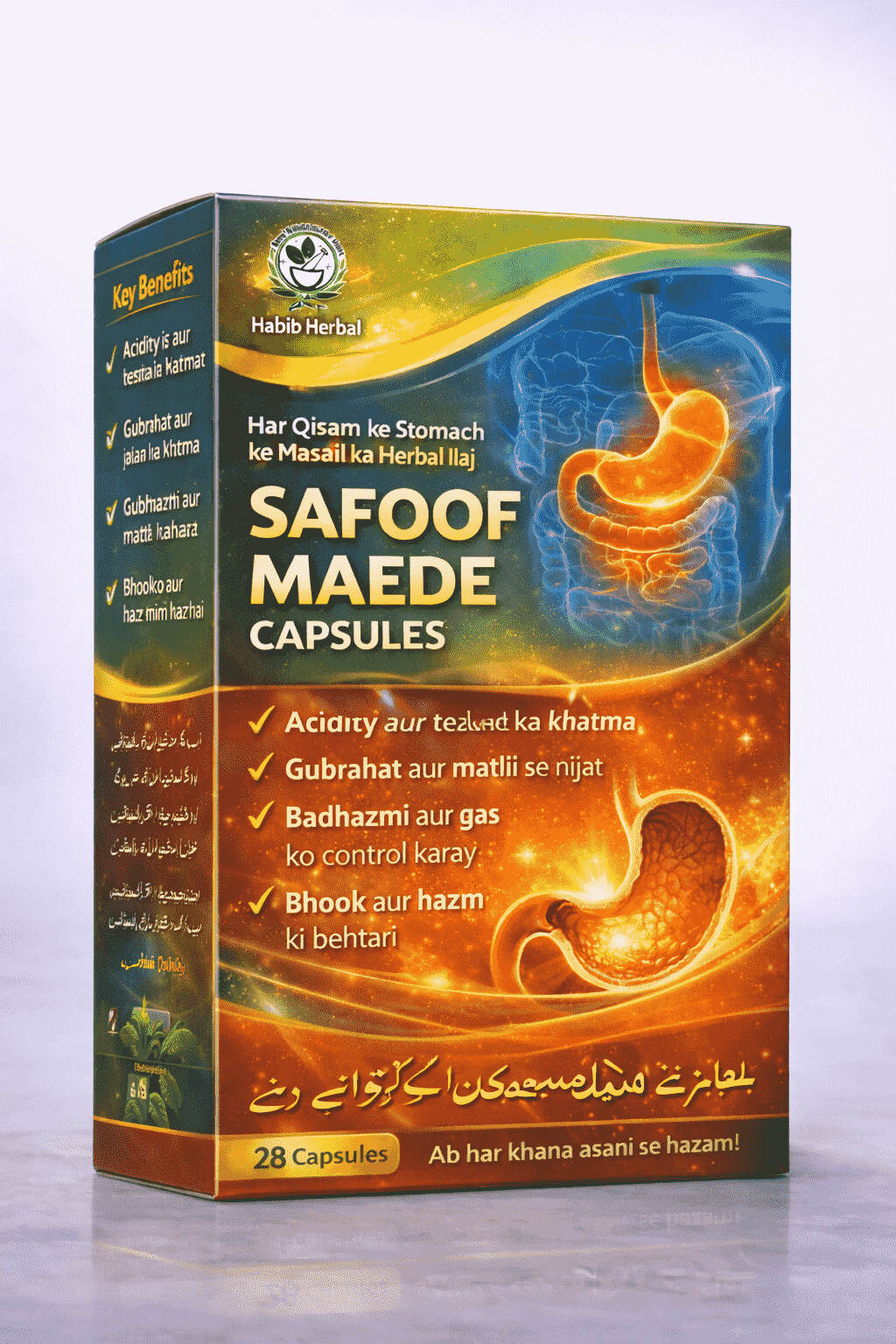 Habib Herbal ka Safoof Maede Capsules maede (stomach) ke masail ka ek khas aur moassar herbal ilaj hai. Yeh qudrati jari bootiyon se tayar kiya gaya formula ghubrahat, matli, tezabiyat aur badhazmi jaise common masail ko door karne mein madad deta hai.